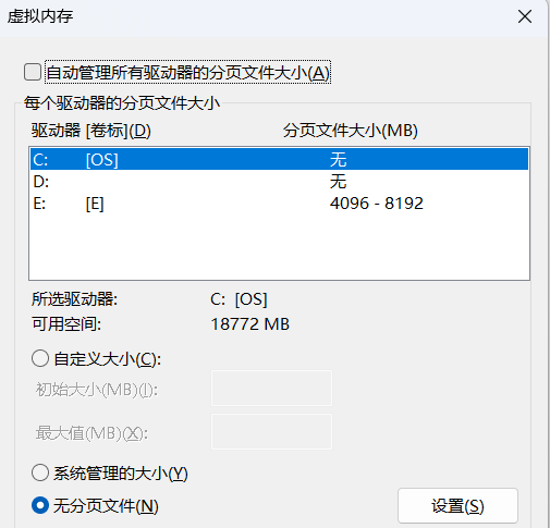 设置方法:取消“自动管理所有驱动器的分页文件大小”,选中C盘,选择“无分页文件”,点击“设置”(此时会提示重启生效,先不重启);再选中空间充足的分区(如D盘),选择“系统管理的大小”或“自定义大小”(自定义建议设置为物理内存的1.5-2倍,例如8GB内存可设为12288MB),点击“设置”,终于点击“确定”,重启电脑即可生效。
