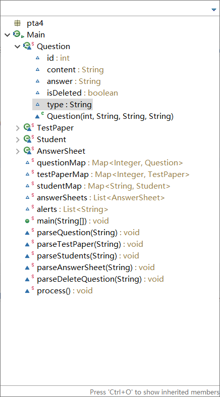 本题在类的设计中,设计的Question 类的功能包括存储题目信息,包括题目ID、内容、答案、是否被删除和题目类型;TestPaper 类的功能包括存储试卷信息,包括试卷ID和题目分数的映射;Student 类用于储存学生信息;AnswerSheet 类用于存储答题卡信息,包括试卷ID、学生ID和学生的答案。主类中包含数据存储结构和主要处理逻辑及解析输入数据、处理题目删除、计算学生成绩、生成警告信息和输出结果。类结构图如下所示: