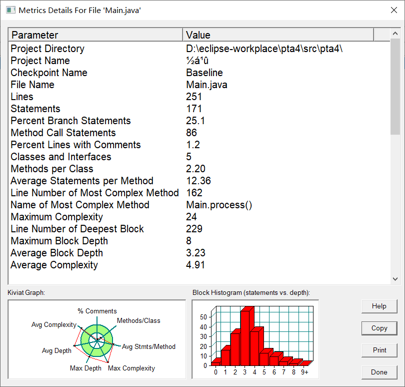 其中显示文件 'Main.java' 共有 251 行代码,其中包含 171 条语句。Main.process() 方法被标识为最复杂的方法,其复杂度为 24,包含了 55 条语句,并且最大代码块深度为 8。平均代码块深度为 3.23,这说明代码的结构相对较为平均.分支语句占总语句的比例为 25.1%,方法调用语句总数为 86。代码包含了 5 个类和接口,平均每个类拥有 2.2 个方法,平均每个方法含有 12.36 条语句。