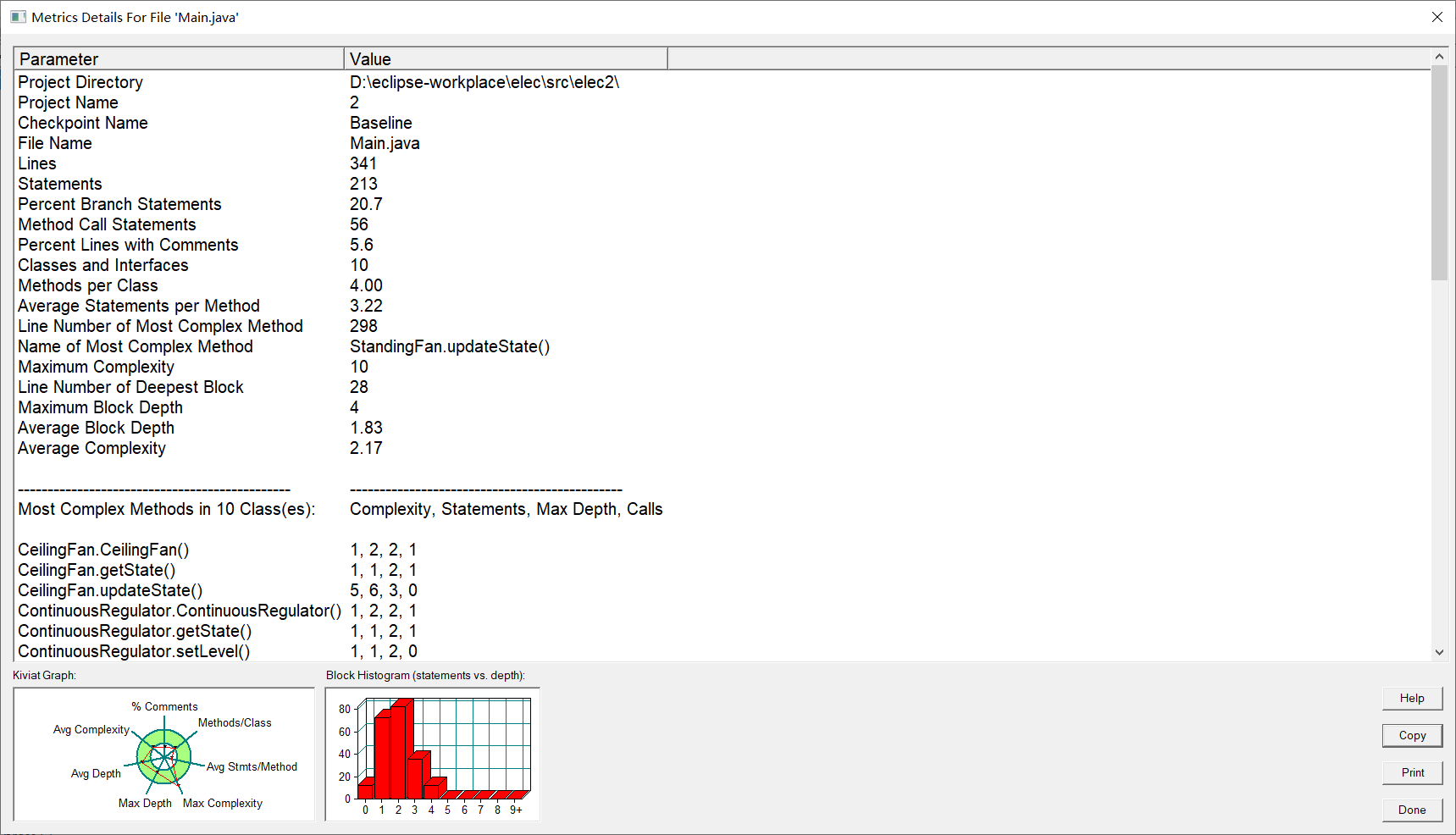 从上图结果来看,大部分方法的复杂度都在5-6左右。每个类的方法数适中,平均每个类有4个方法。每个方法的平均语句数为3.22,代码中大部分方法相对较短。大部分块深度集中在1到2之间,代码的嵌套层次适中。