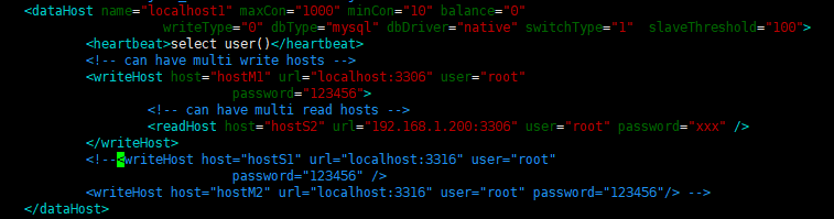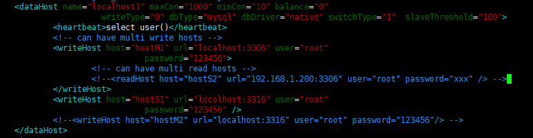 2.Mycat配置读写分离,两种方式:(1)在writeHost里配置readHost。(2)多个writeHost。两种方式以截图的形式放在下面展示: