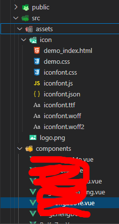 2、在Vue项目中assets文件夹下新增一个icon文件夹,将下载下来的文件解压到icon文件夹