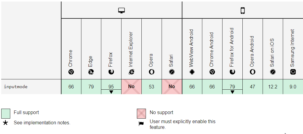规范冲突: WHATWG(超文本应用技术工作组) 规范中列出了 inputmode, 并且现代浏览器正在努力支持它。但 W3C HTML 5.2 规范 不再将其列出(也就是说将其标记为过时的)。在达成共识之前,你应该认为 WHATWG 规范定义的就是正确的。