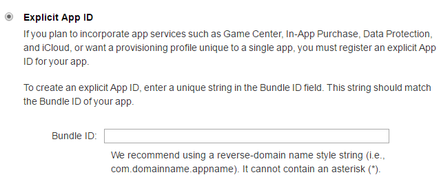 这是你appid的后缀,这个需要仔细。因为这个内容和你的程序直接相关,后面很多地方要用到,最好是com.yourcompany.yourappname的格式,我用的是项目中的Bundle ID(反正这样是最保险的)