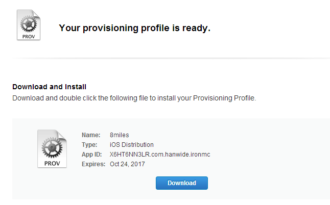 填好名字就可以有一个描述文件了,下载即可,后缀名是.mobileprovision,下载下来就可以用。