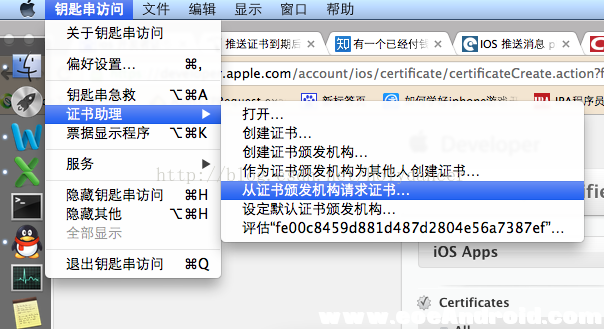 在实用工具找到-钥匙串访问(KEY CHAIN),在证书助理中,选择"从证书颁发机构求证书",如下图: