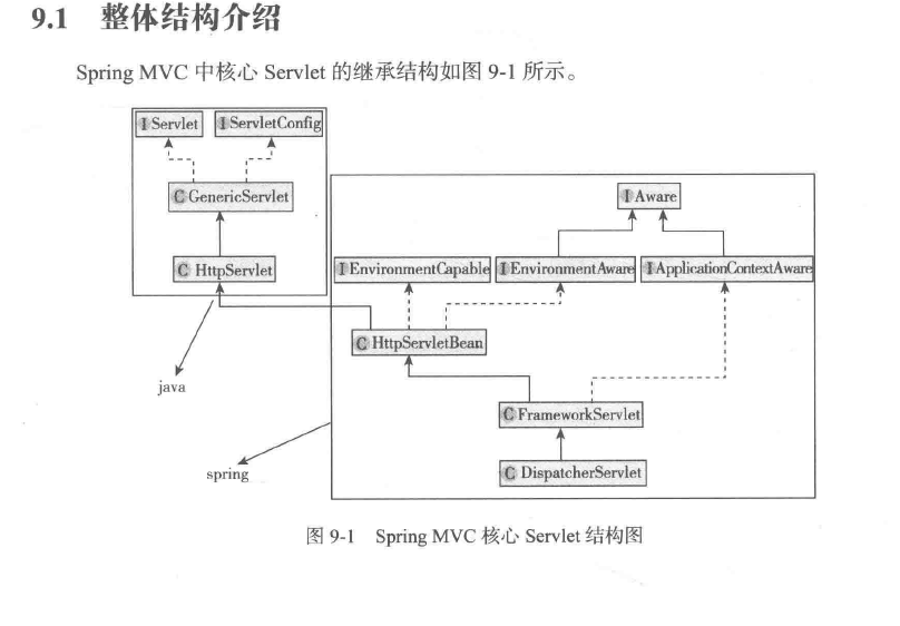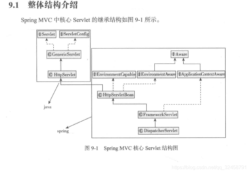 HttpServletBean继承自Httpservlet用来将servlet的一些配置设置到相应的属性(请求以及tomcat),FrameWorkServlet初始化了webApplicationContext(spring相关),DispatcherSrevlet初始化了自身9大组件。