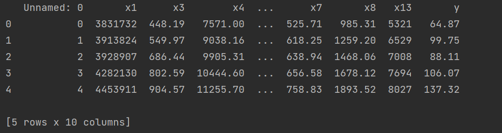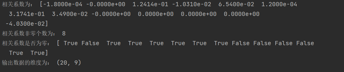 import numpy as np import pandas as pd from sklearn.linear_model import Lasso inputfile = "D:\python_data\data_caizhengshouru.csv" data = pd.read_csv(inputfile) #读取数据 lasso = Lasso(1000) #调用Lasso()函数,设置λ的值为1000 lasso.fit(data.iloc[:,0:13],data['y']) print('相关系数为:',np.round(lasso.coef_,5)) #输出结果,保留五位小数 print('相关系数非零个数为:',np.sum(lasso.coef_ !=0)) #计算相关系数非零的个数 mask = lasso.coef_ !=0 #返回一个相关系数是否为零的布尔数组 mask = np.append(mask,True) #将mask的元素补齐到14个 print('相关系数是否为零:',mask) outputfile = "D:\python_data\_new_reg_data.csv" #输出的数据文件 new_reg_data = data.iloc[:,mask] #返回相关系数非零的数据 new_reg_data.to_csv(outputfile) #存储数据 print('输出数据的维度为:',new_reg_data.shape) #查出输出数据的维度