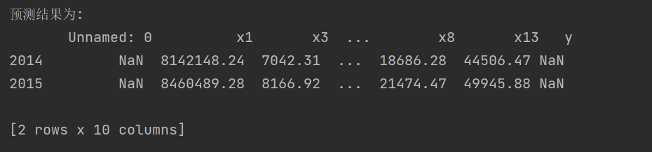 import sys sys.path.append("D:/python_data/GM11.py") import numpy as np import pandas as pd from GM11 import GM11 #引入自编的灰色预测函数 inputfile1 = "D:\python_data\_new_reg_data.csv" inputfile2 = "D:\python_data\data_caizhengshouru.csv" new_reg_data = pd.read_csv(inputfile1) #读取经过属性选择后的数据 data = pd.read_csv(inputfile2) #读取总的数据 new_reg_data.index = range(1994,2014) new_reg_data.loc[2014] = None new_reg_data.loc[2015] = None cols = ['x1','x3','x4','x5','x6','x7','x8','x13'] for i in cols: f = GM11(new_reg_data.loc[range(1994, 2014),i].values)[0] new_reg_data.loc[2014,i] = f(len(new_reg_data)-1) #2014年预测结果 new_reg_data.loc[2015,i] = f(len(new_reg_data)) #2015年预测结果 new_reg_data[i] = new_reg_data[i].round(2) #保留两位小数 outputfile = ("D:\python_data\_new_reg_data_GM11.xls") #灰色预测后保存的路径 y = list(data['y'].values) #提取财政收入列,合并至新数据框中 y.extend([np.nan,np.nan]) new_reg_data['y'] = y new_reg_data.to_excel(outputfile) #结果输出 print('预测结果为:\n',new_reg_data.loc[2014:2015,:]) #预测展示