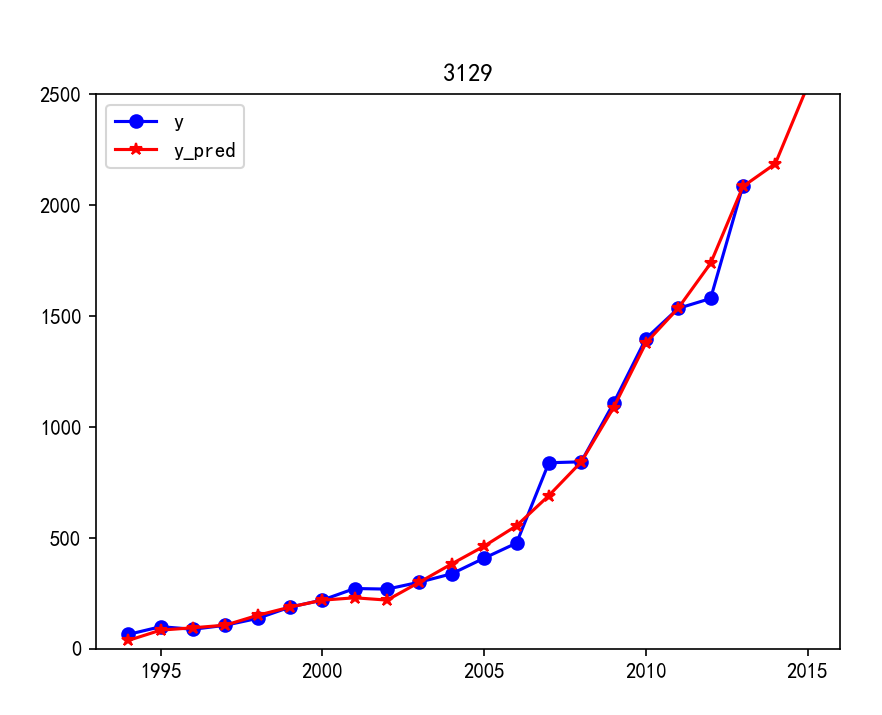 #真实值与预测值重合图 import matplotlib.pyplot as plt p = data[['y', 'y_pred']].plot(style=['b-o', 'r-*']) p.set_ylim(0, 2500) p.set_xlim(1993, 2016) plt.rcParams['font.sans-serif'] = ['SimHei'] # 添加这条可以让图形显示中文 plt.title('3129') plt.show()
