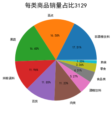inputfile1 = "D:\python_data\GoodsOrder.csv" inputfile2 = "D:\python_data\GoodsTypes.csv" data = pd.read_csv(inputfile1,encoding = 'gbk') types = pd.read_csv(inputfile2,encoding = 'gbk') # 读入数据 group = data.groupby(['Goods']).count().reset_index() sort = group.sort_values('id',ascending = False).reset_index() data_nums = data.shape[0] # 总量 del sort['index'] sort_links = pd.merge(sort,types) # 根据type合并两个datafreame # 根据类别求和,每个商品类别的总量,并排序 sort_link = sort_links.groupby(['Types']).sum().reset_index() sort_link = sort_link.sort_values('id',ascending = False).reset_index() del sort_link['index'] # 删除“index”列 # 求百分比,然后更换列名,最后输出到文件 sort_link['count'] = sort_link.apply(lambda line: line['id']/data_nums,axis=1) sort_link.rename(columns = {'count':'percent'},inplace = True) print('各类别商品的销量及其占比:\n',sort_link) outfile1 = "D:\python_data\percent.csv" sort_link.to_csv(outfile1,index = False,header = True,encoding='gbk') # 保存结果 # 画饼图展示每类商品销量占比 import matplotlib.pyplot as plt data = sort_link['percent'] labels = sort_link['Types'] plt.figure(figsize=(8, 6)) # 设置画布大小 plt.pie(data,labels=labels,autopct='%1.2f%%') plt.rcParams['font.sans-serif'] = 'SimHei' plt.title('每类商品销量占比3129',fontdict={'size': 20}) # 设置标题 plt.show()