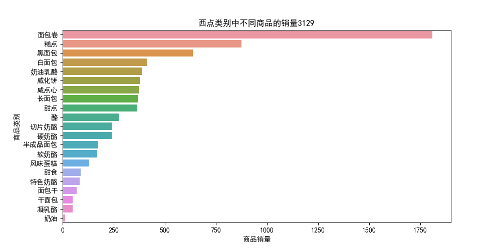 import seaborn as sns #西点 selected = sort_links.loc[sort_links['Types'] == '西点'] # 挑选商品类别为“西点”并排序 # 绘制西点类别中不同商品占比的条形图 plt.figure(figsize=(10, 5)) sns.barplot(x=list(selected["id"]), y=list(selected["Goods"])) plt.xlabel("商品销量") plt.ylabel("商品类别") plt.rcParams['font.sans-serif'] = 'SimHei' plt.title("西点类别中不同商品的销量3129") plt.show() # 先筛选“西点”类型的商品,然后求百分比,然后输出结果到文件。 selected = sort_links.loc[sort_links['Types'] == '西点'] # 挑选商品类别为“西点”并排序 child_nums = selected['id'].sum() # 对所有的“西点”求和 selected['child_percent_xidian'] = selected.apply(lambda line: line['id']/child_nums,axis = 1) # 求百分比 selected.rename(columns = {'id':'count'},inplace = True) print('西点内部商品的销量及其占比:\n',selected) outfile3 = "D:\python_data\child_percent_xidian.csv" sort_link.to_csv(outfile3,index = False,header = True,encoding='gbk') # 输出结果 # 画饼图展示西点内部各商品的销量占比 data = selected['child_percent_xidian'] labels = selected['Goods'] plt.figure(figsize = (8,6)) # 设置画布大小 explode = (0.05,0.04,0.04,0.05,0.06,0.07,0.03,0.03,0.03,0.02,0.03,0.02,0.02,0.02,0.02,0.08,0.3,0.34,0.38,0.4,0.8) # 设置每一块分割出的间隙大小 plt.pie(data,explode = explode,labels = labels,autopct = '%1.2f%%', pctdistance = 1.1,labeldistance = 1.2) plt.rcParams['font.sans-serif'] = 'SimHei' plt.title("西点内部各商品的销量占比3129",fontdict={'size': 20}) # 设置标题 plt.axis('equal') plt.show() # 展示图形