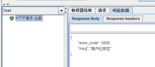 请求的结果,因为该账号已经存在,所以提示“用户已经存在”。如果时注册的新账号,会提示注册成功。(ps:用户名、密码都有格式限制,如果注册的格式不正确,会返回不同的提示)