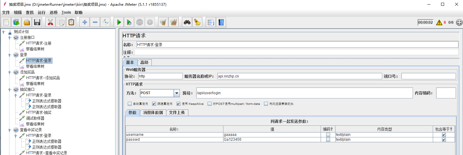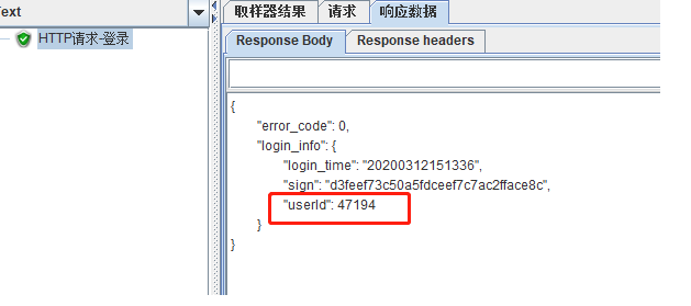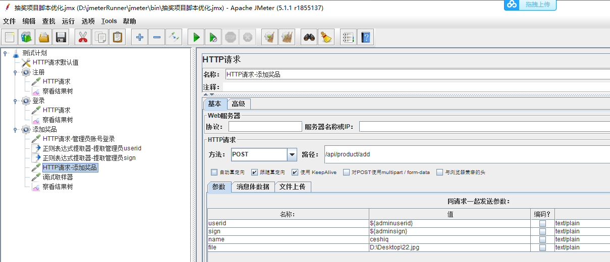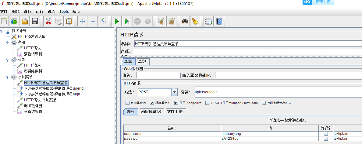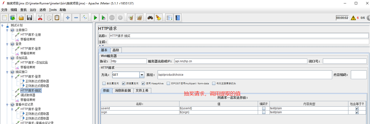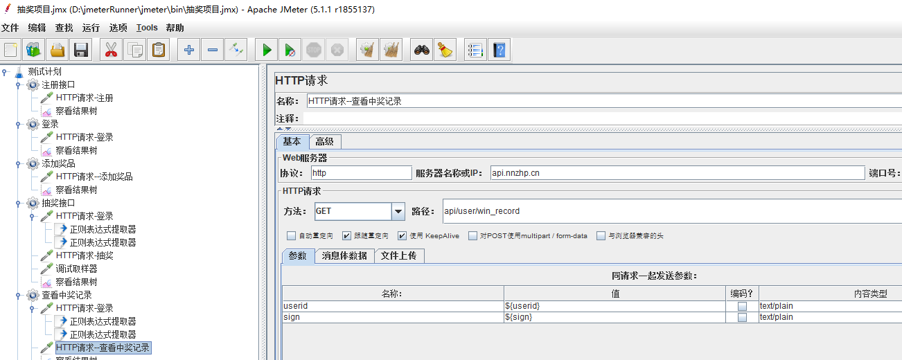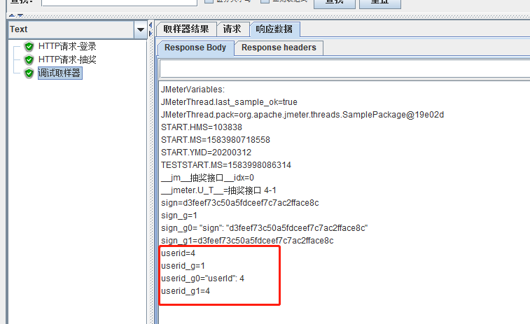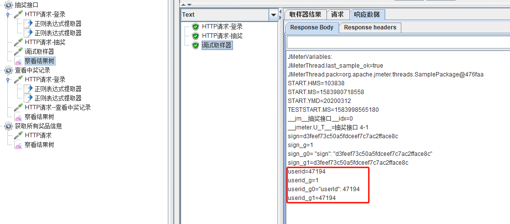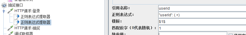 抽奖接口的参数,可以看到是登录以后才可以抽奖,因此在线程组下,添加一个http的登录请求,在登录请求下添加两个正则表达式分别提取userid、sign,添加调试取样器查看提取的数值(这个非常有用)。添加http抽奖请求,添加结果树