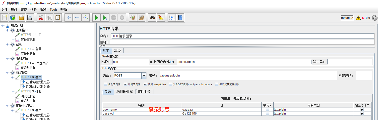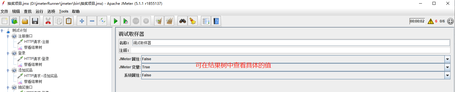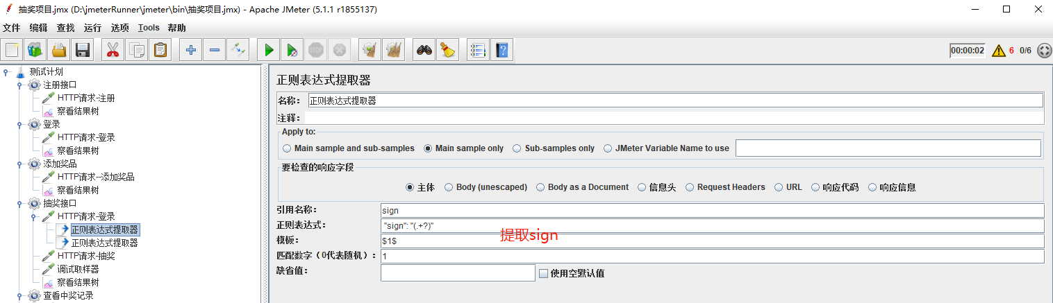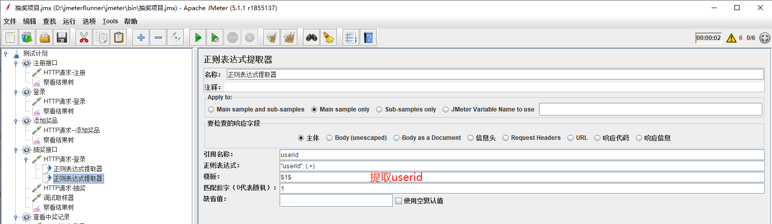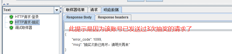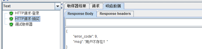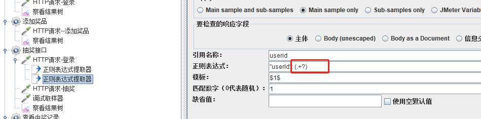 在用正则表达式的时候,形成了一个定向思维,提取值一般都用(.+?)或者(.*?),但是用了以后发现抽奖结果中会一直提示该账号不存在。就想到提取的时候应该出错了,添加了调试取样器查看。