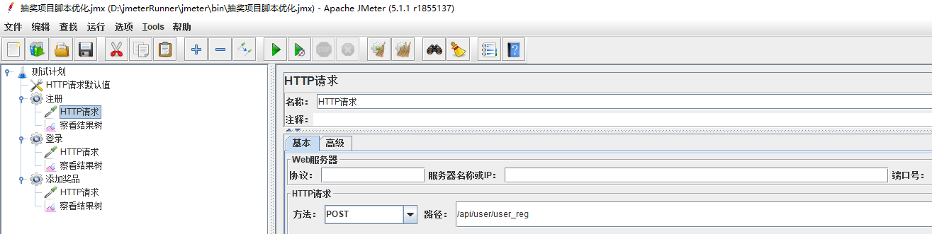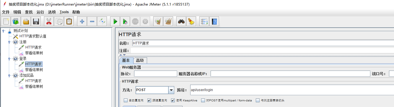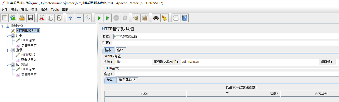 上述脚本中,请求的协议和服务器都是一样的。将所有http请求中相同的部分提取出来,填入http请求默认值中。