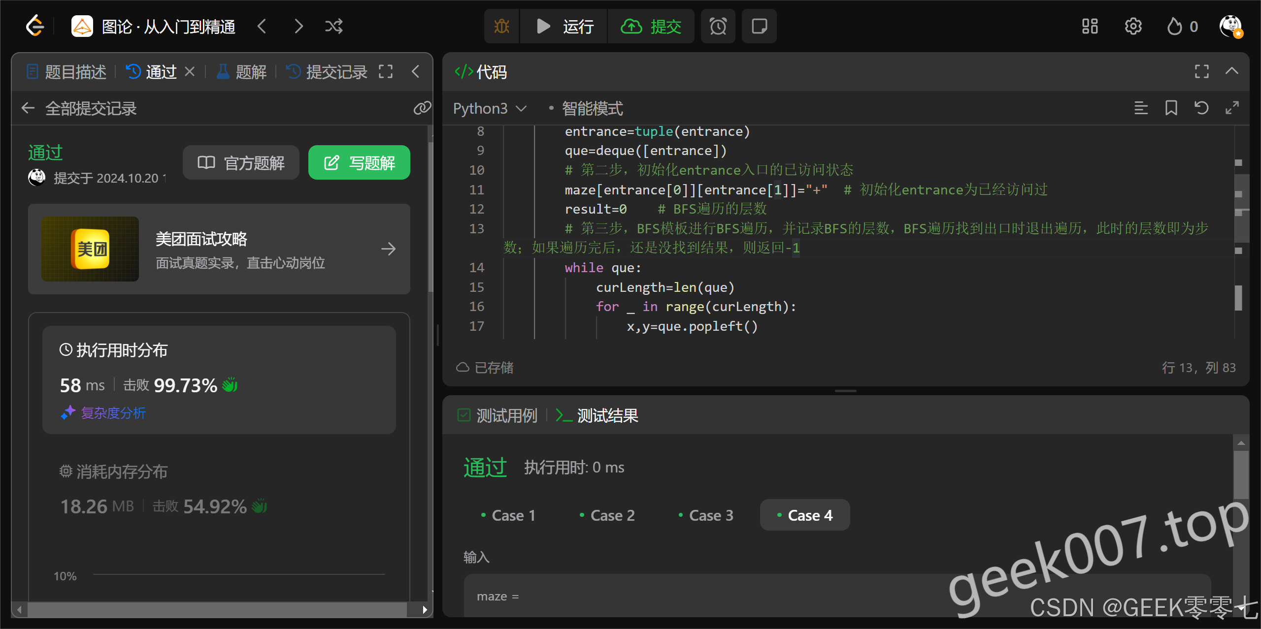 # 第三步,BFS模板进行BFS遍历,并记录BFS的层数,BFS遍历找到出口时退出遍历,此时的层数即为步数;如果遍历完后,还是没找到结果,则返回-1