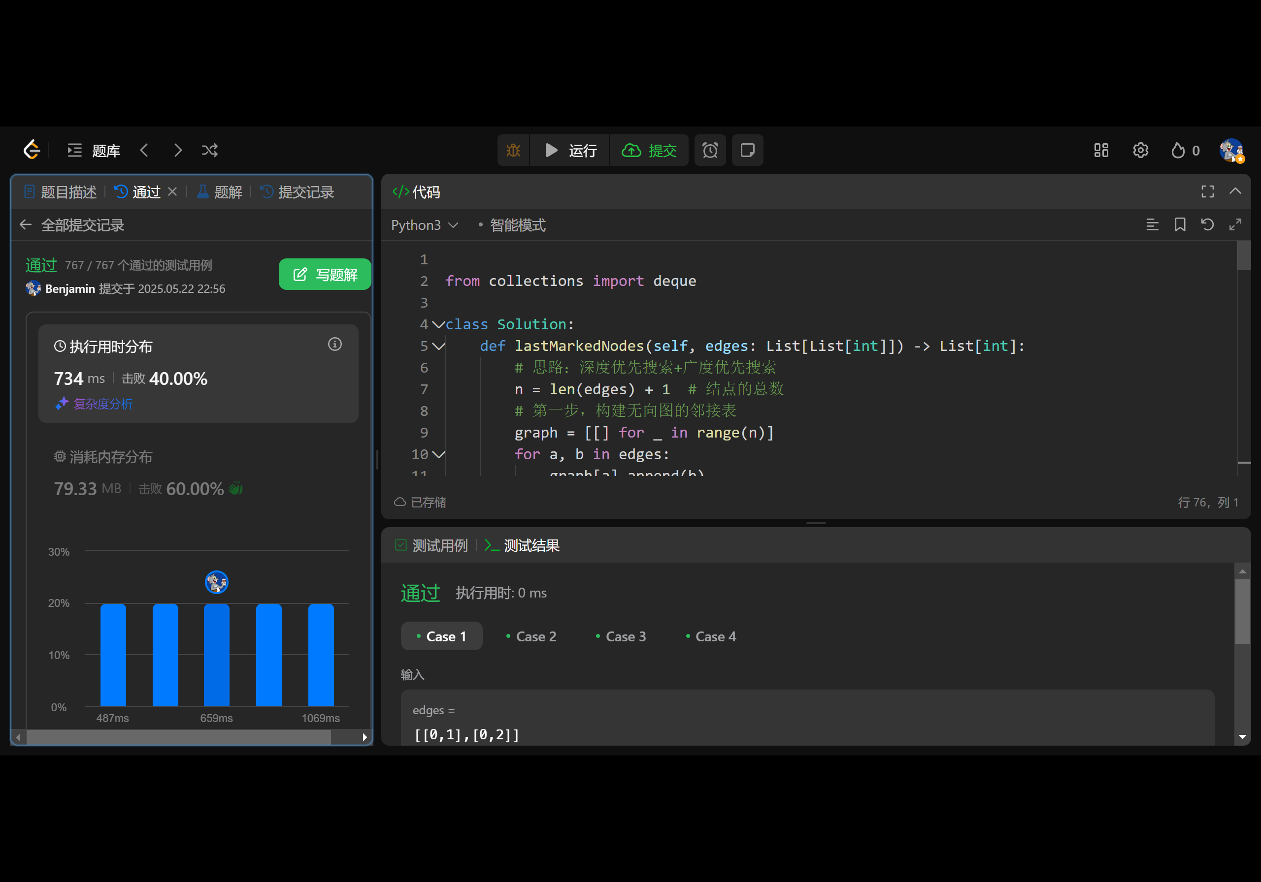第四步,遍历所有节点,枚举结点node,根据dists1和dists2选择p1和p2中距离node更远的节点,构建数组result,并进行返回
