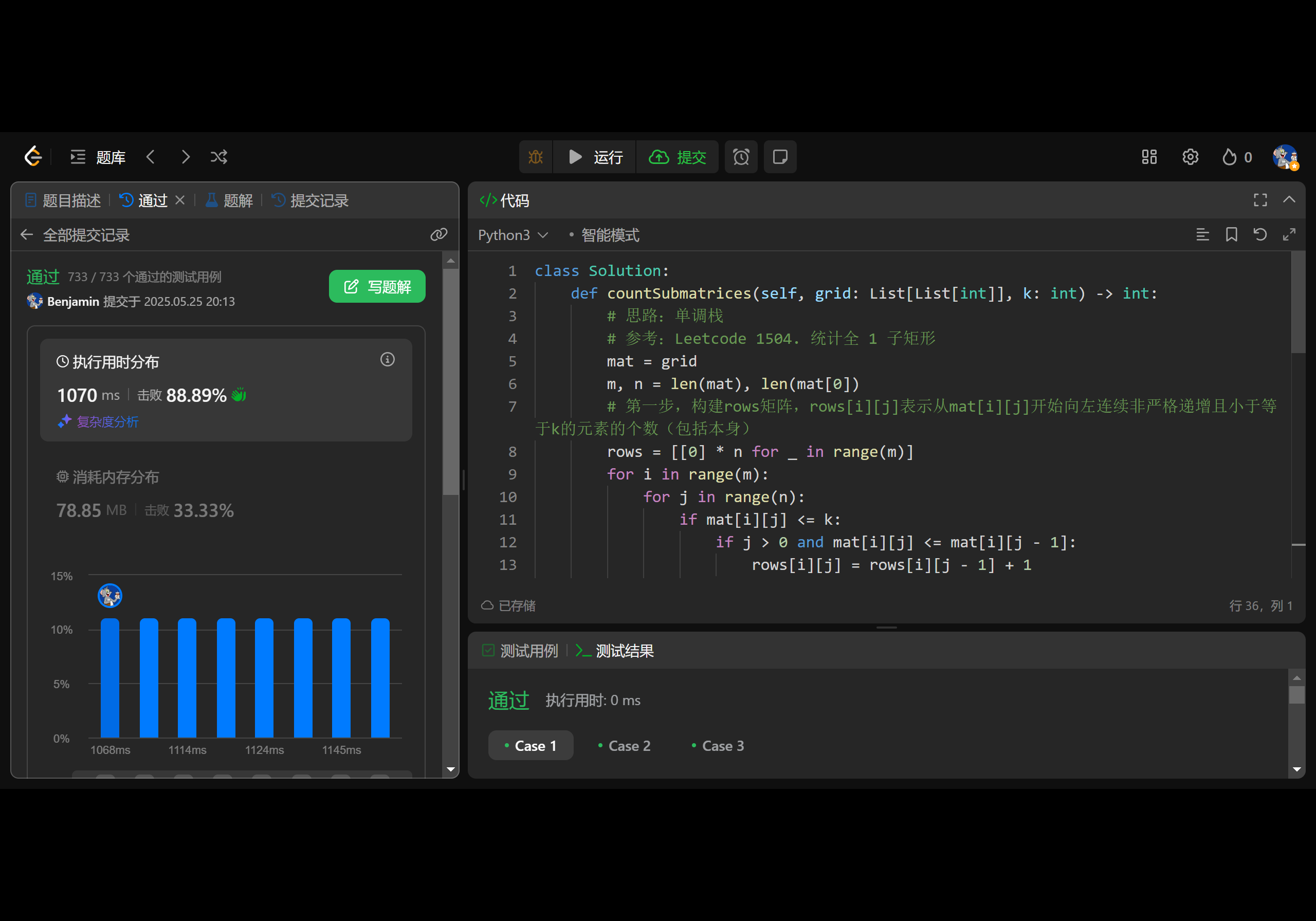 # 第一步,构建rows矩阵,rows[i][j]表示从mat[i][j]开始向左连续非严格递增且小于等于k的元素的个数(包括本身)