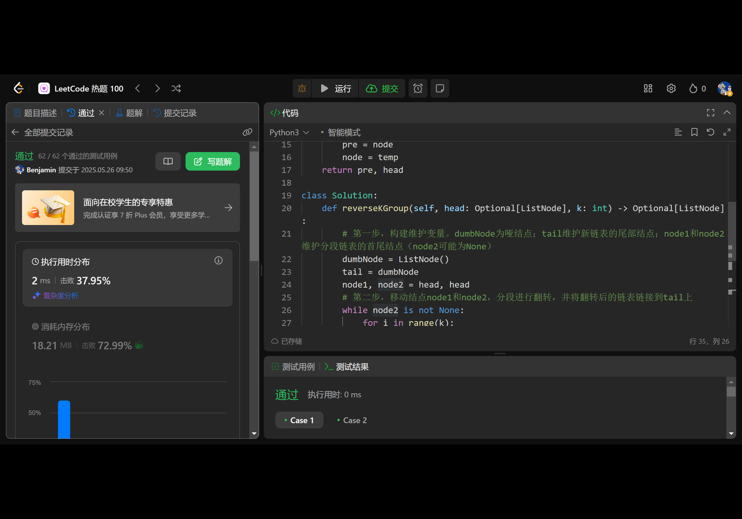 # 第一步,构建维护变量。dumbNode为哑结点;tail维护新链表的尾部结点;node1和node2维护分段链表的首尾结点(node2可能为None)