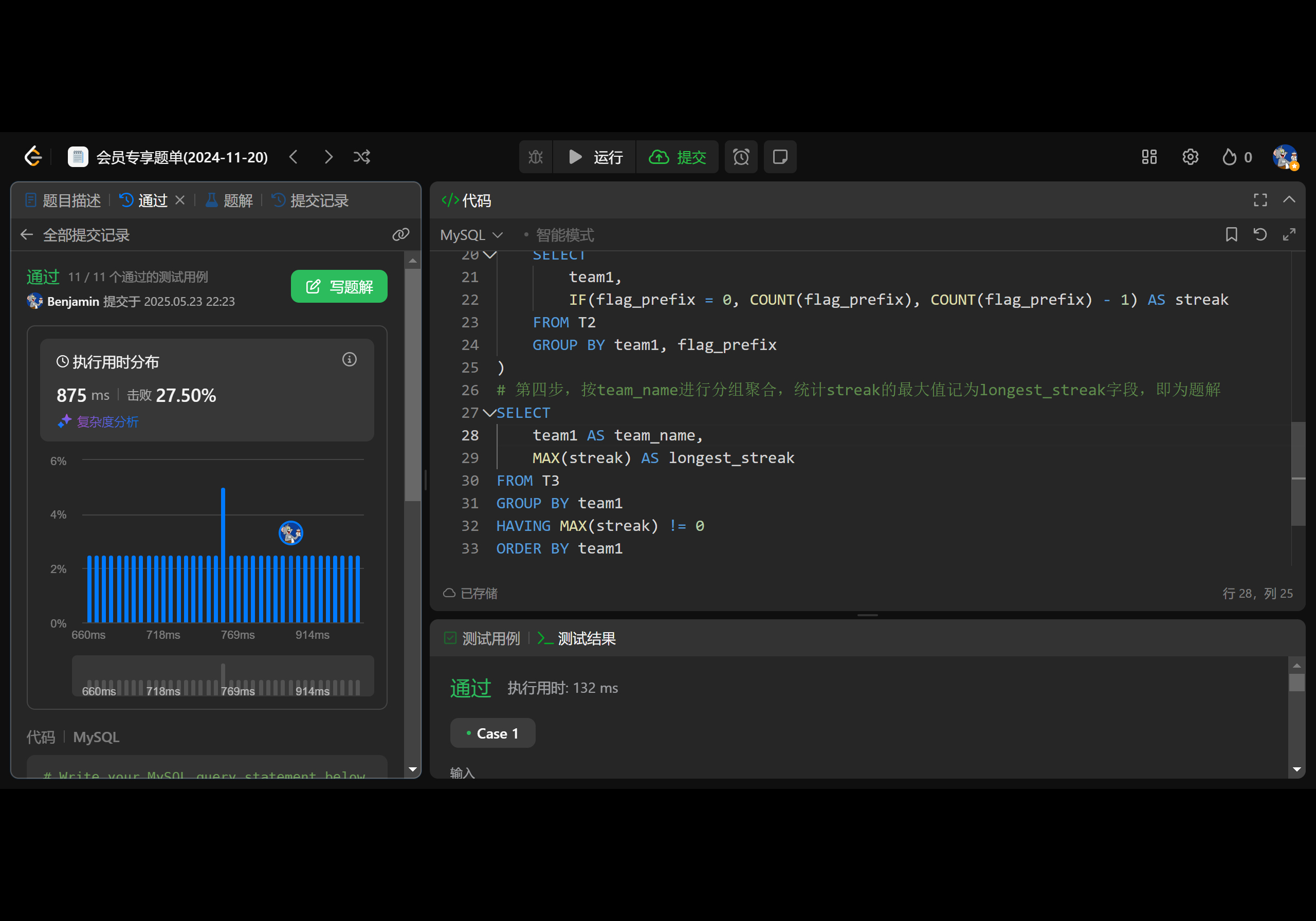 第四步,按team_name进行分组聚合,统计streak的最大值记为longest_streak字段,即为题解