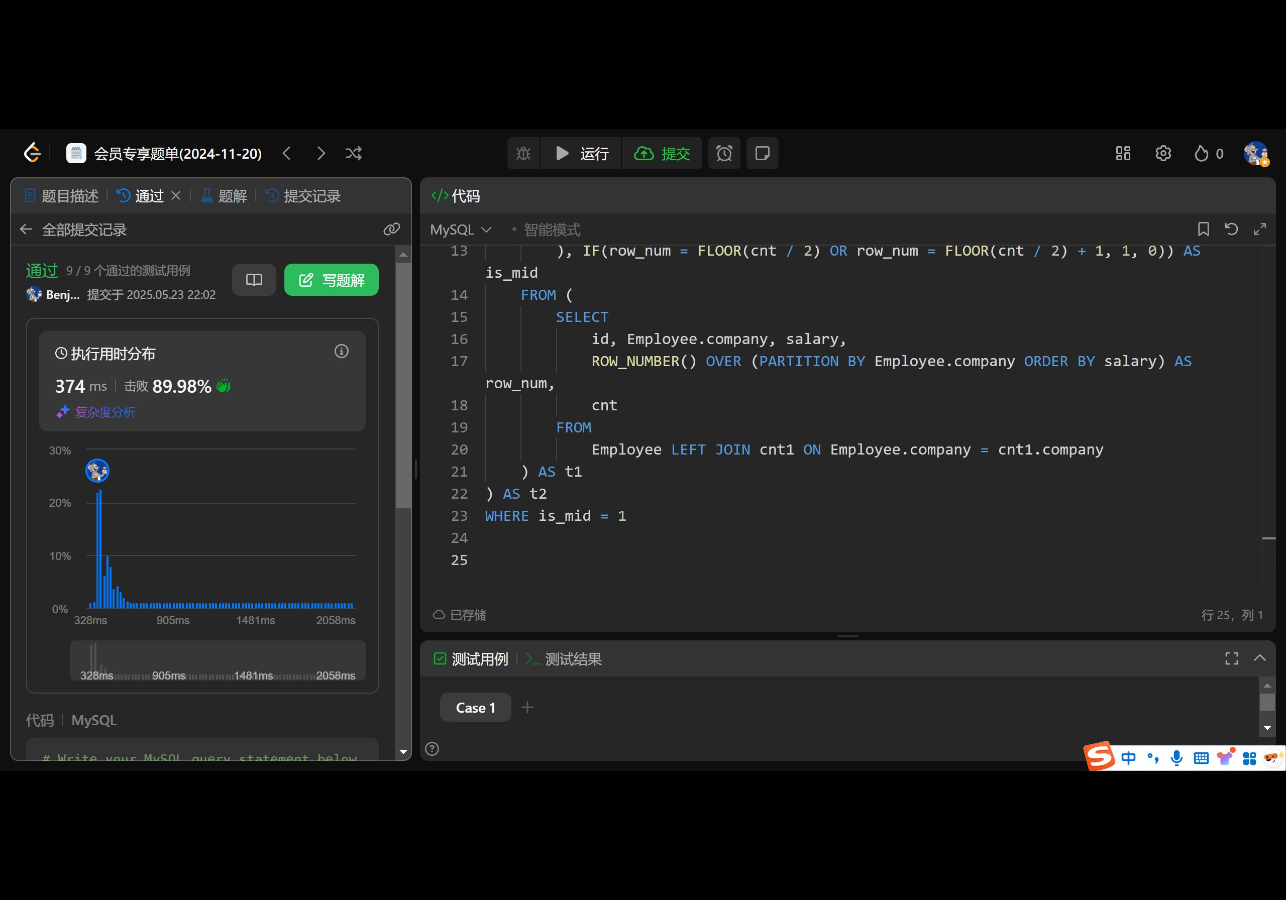 先在with中统计每个公司的员工数量,然后使用窗口函数计算每个公司按salary升序排列的行号,然后判断每一个记录是不是中位数记录,最后筛选即可