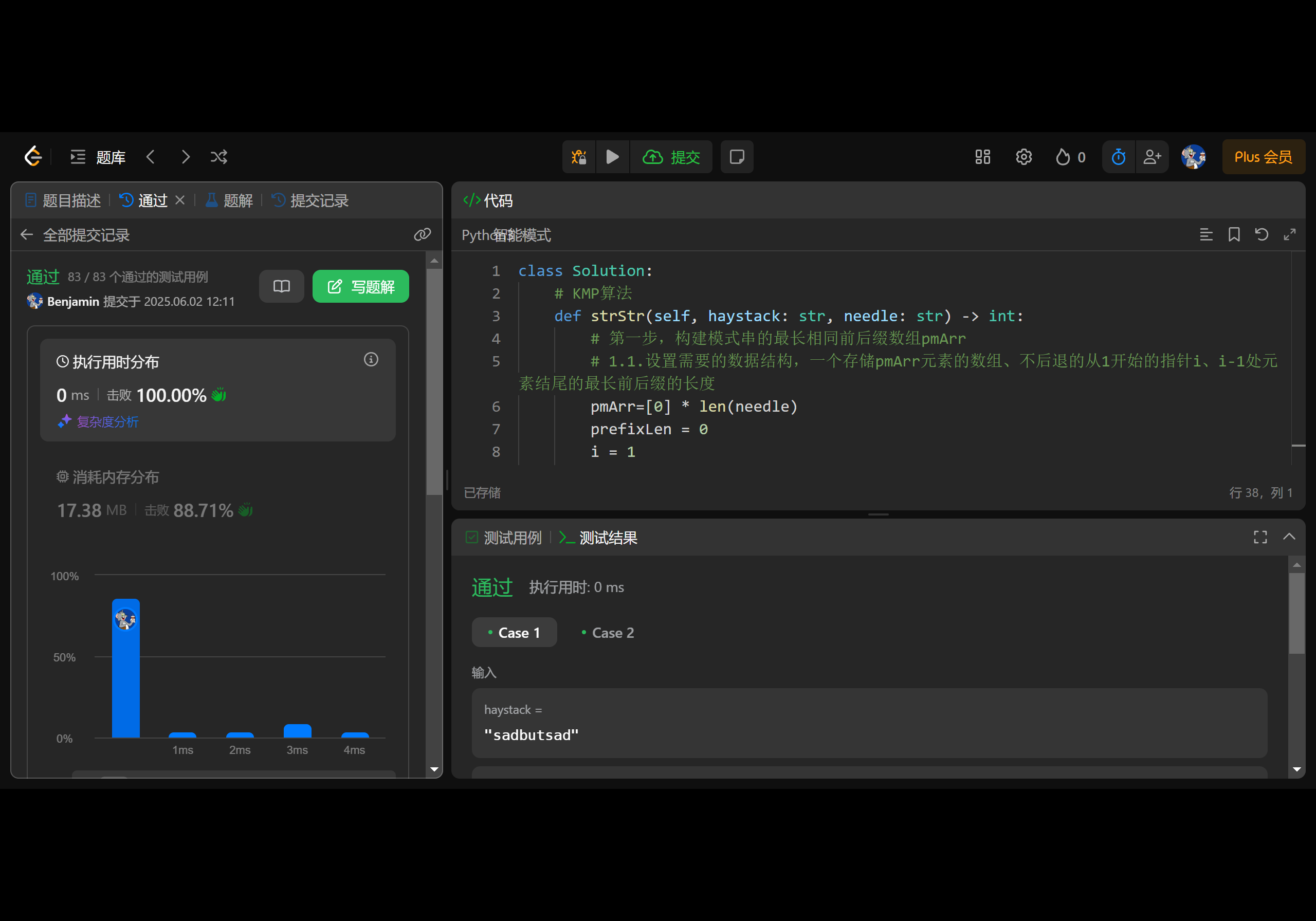第二步,根据pmArr数组进行子串匹配。让i和j指针分别指向被匹配串和模式串的元素,i指针不后退的遍历主串。过程中,如果i和j指向的元素值相同,i和j指针同时向前走一步;如果不相等,且j指针指向模式串的开头,则i指针前进一位;如果不相等,且j指针没有指向模式串的头部,则根据从pmArr中取出的j-1处元素结尾的最长前后缀的长度,并以此更新j的指针位置。如果过程中j等于模式串的长度,说明匹配成功,直接返回下标。