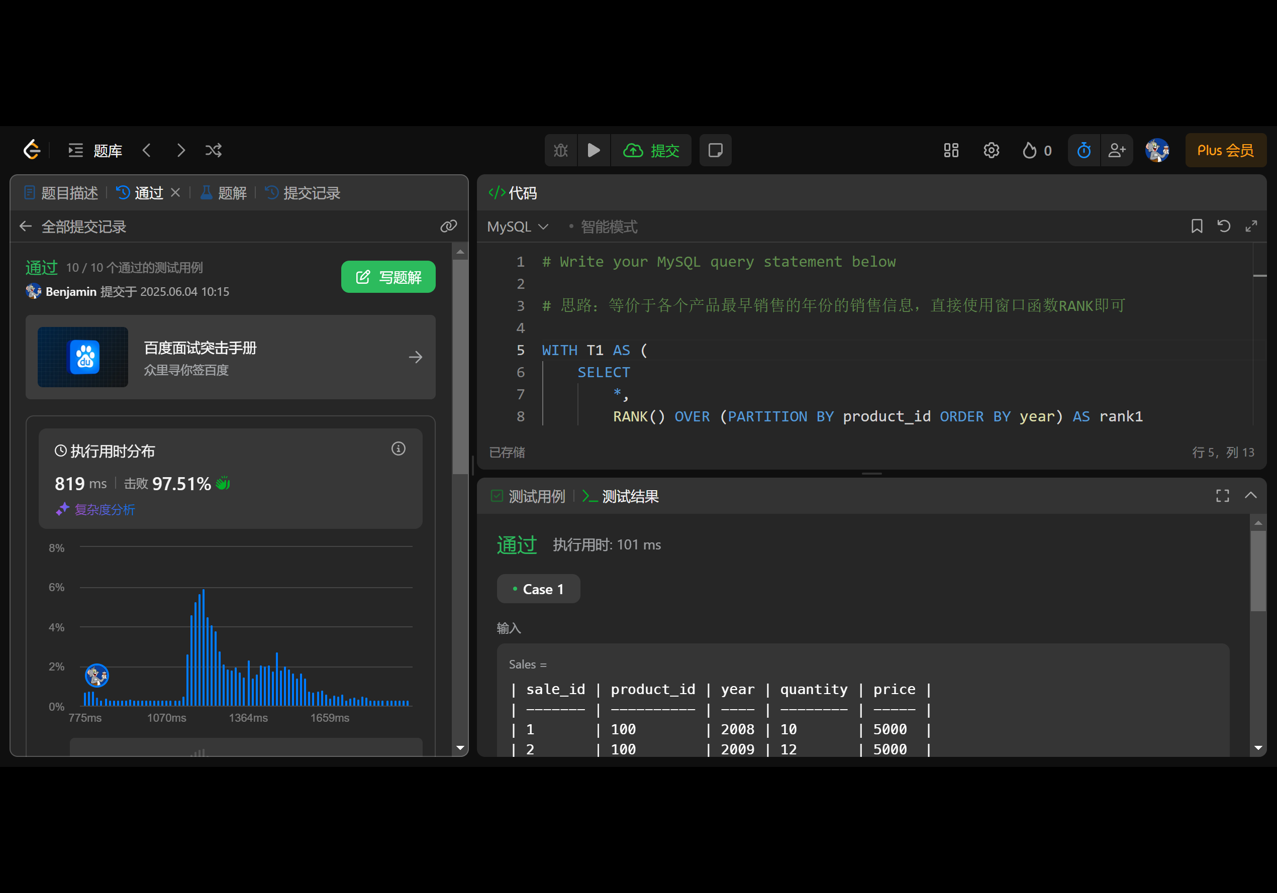 # 思路:等价于各个产品最早销售的年份的销售信息,直接使用窗口函数RANK即可