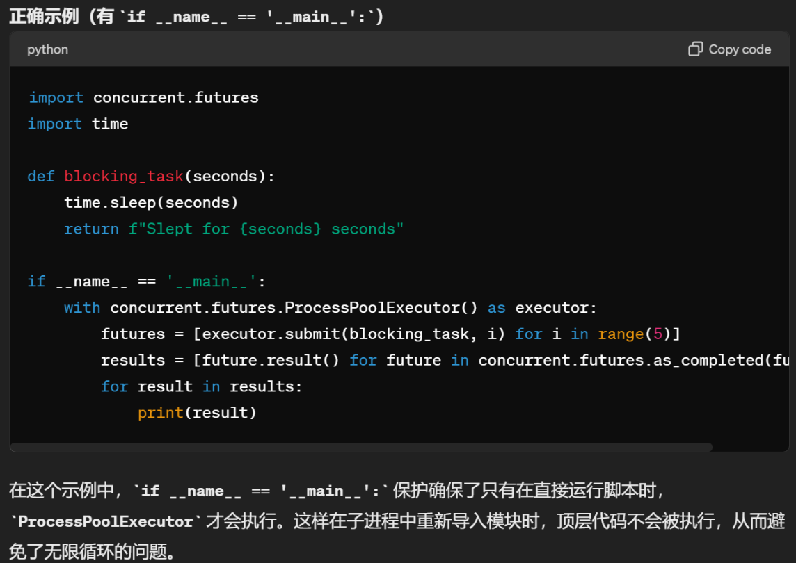 创建一个进程池 pool,用于并行执行任务。ProcessPoolExecutor 适合 CPU 密集型任务,通过在多个进程中分配任务,提高并行执行能力。