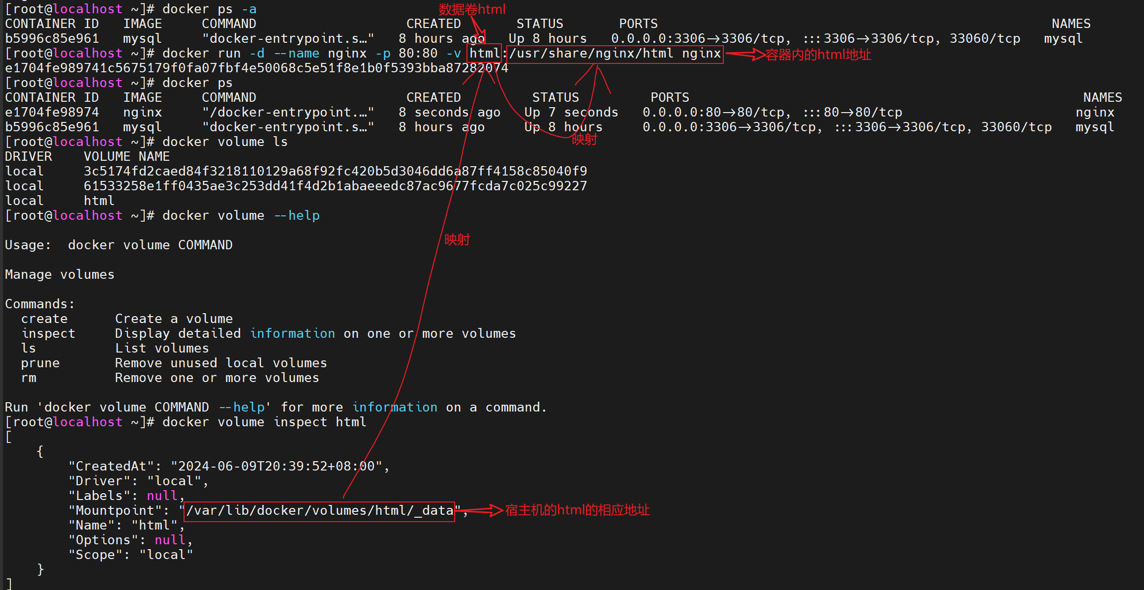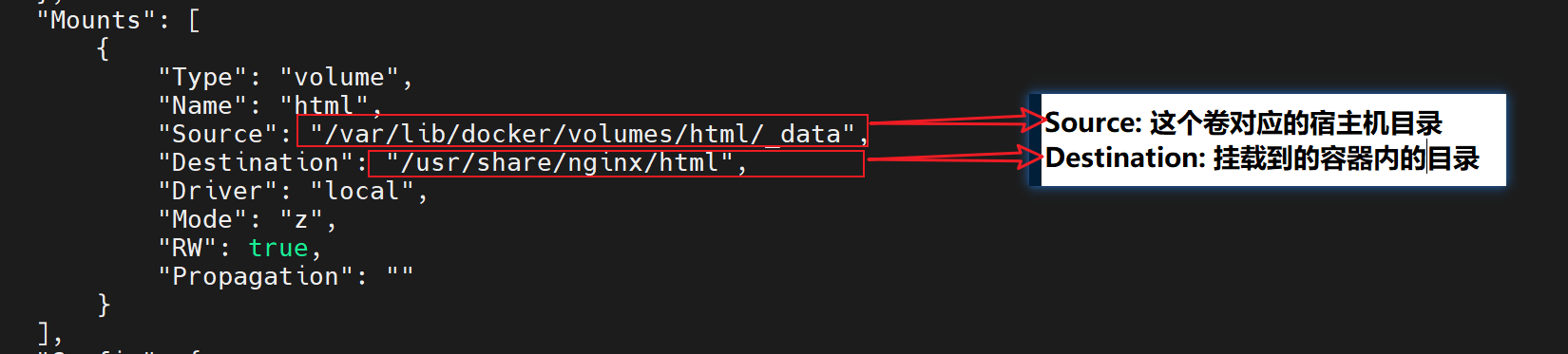 4、在执行如下命令后:docker inspect html / 或 docker volume inspect html 【html是volume数据卷的名称】