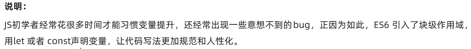 - 声明被提升:JavaScript 引擎会把变量和函数的声明提升到当前作用域的顶部(无论是全局作用域还是函数作用域)。