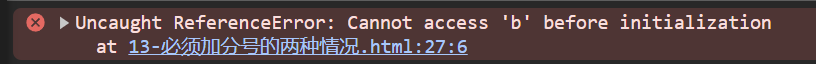 在这种情况下,JavaScript 会试图把 [b, a] 解释为前一行 let b = 2 的延续部分,就像它在做数组索引一样。例如,它可能会误以为你想这样写: