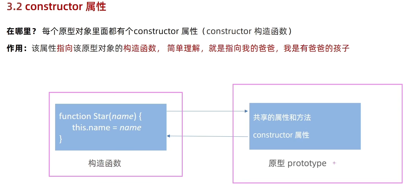 prototype属性,它是一个对象,定义了由该构造函数创建的实例所共享的属性和方法。 - 换句话说,当使用构造函数创建一个新对象时,该对象会自动继承构造函数的原型对象中的属性和方法。