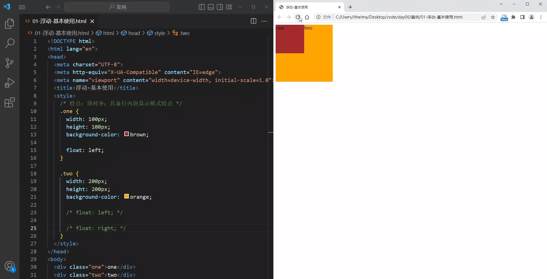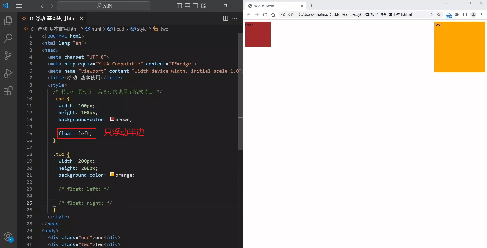 浏览器此时会认为,.one已经不存在了(因为已经设置了浮动float),所以.two就会移到最左边来。