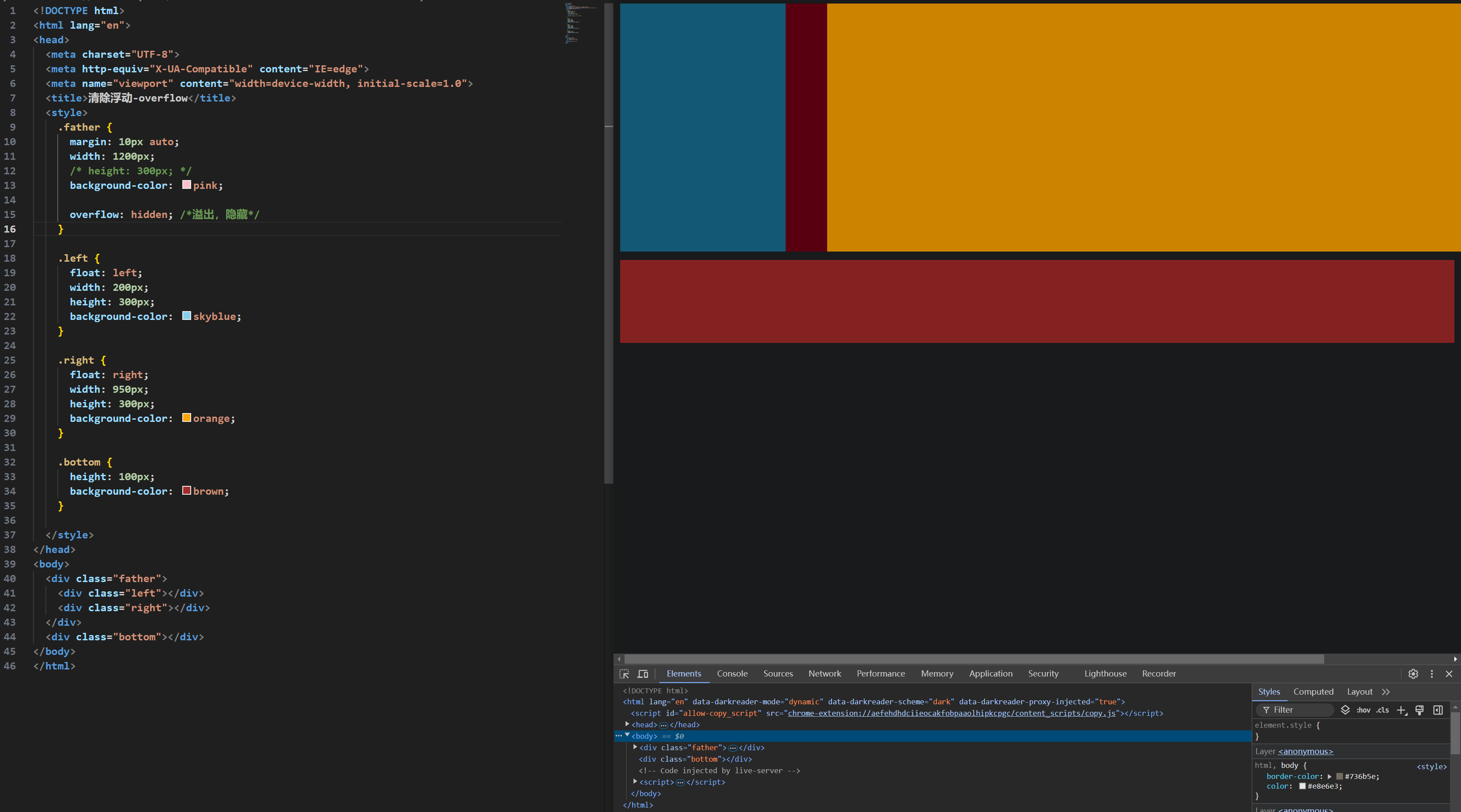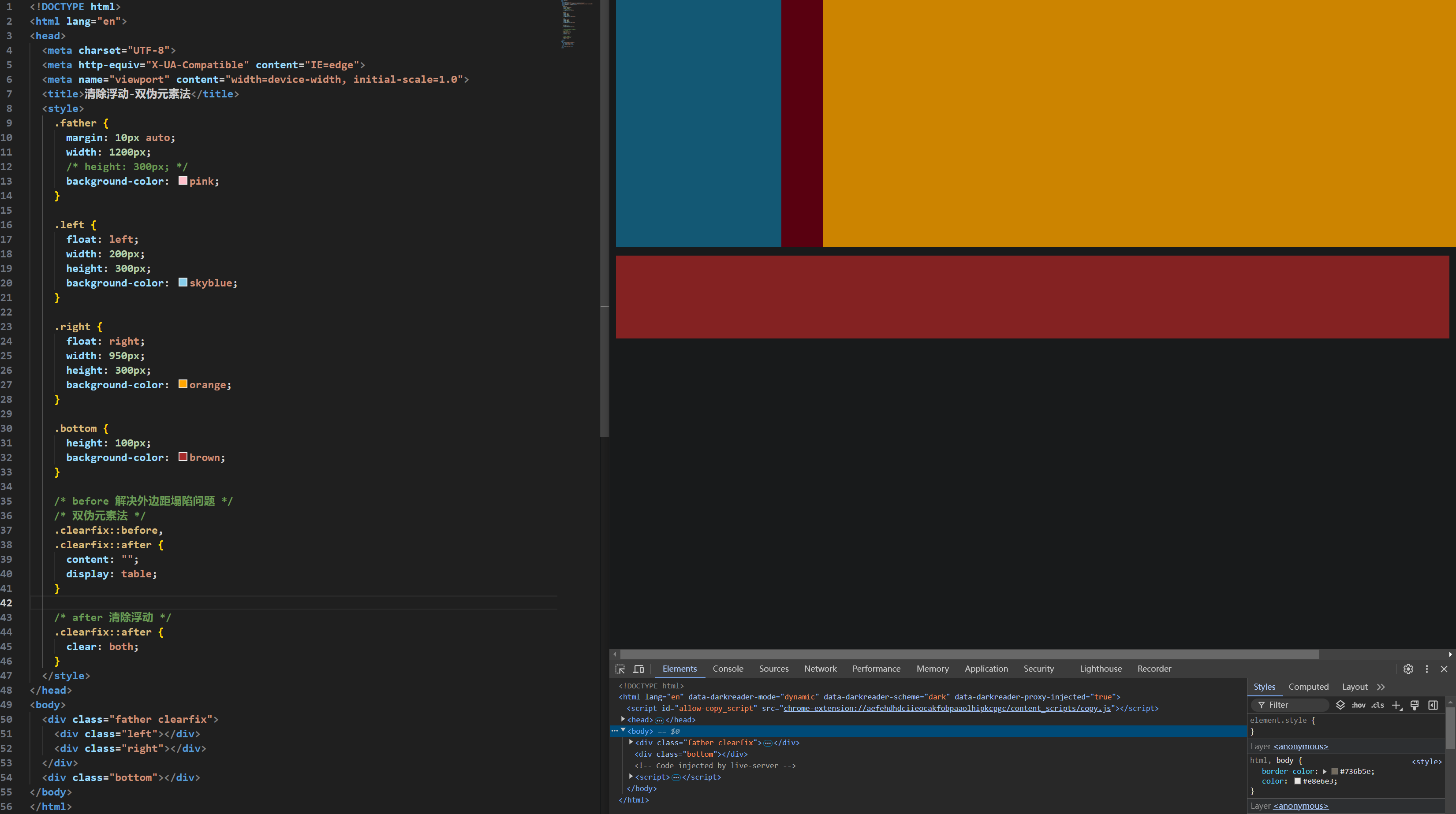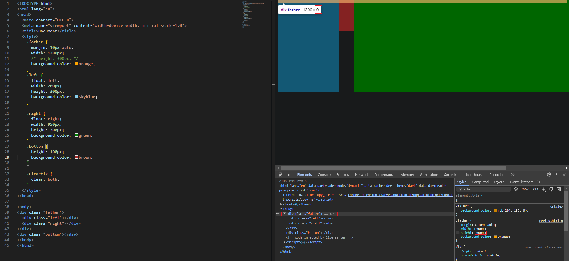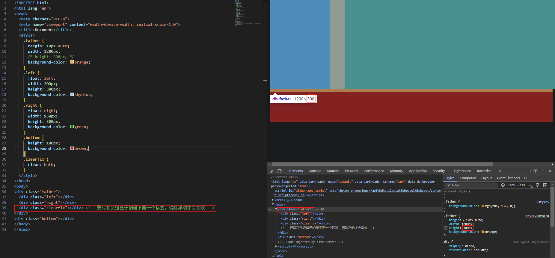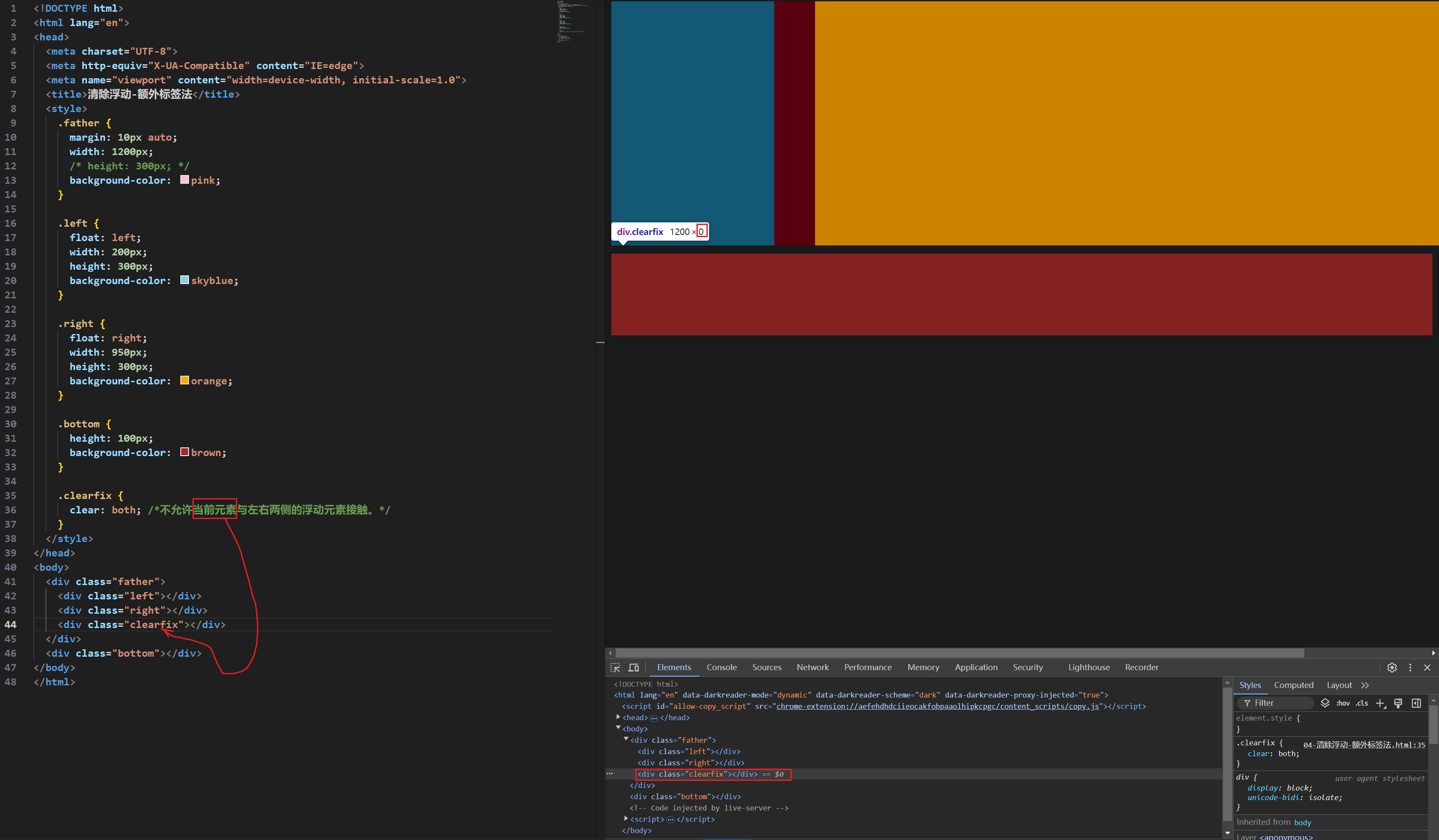 .left和.right是浮动的,.father容器的高度会因为这两个浮动元素而被压缩(看起来像没有内容)。为了确保.bottom元素位于.father容器的下方,而不是被浮动元素“挤压”,我们插入了一个.clearfix元素并设置clear: both;。