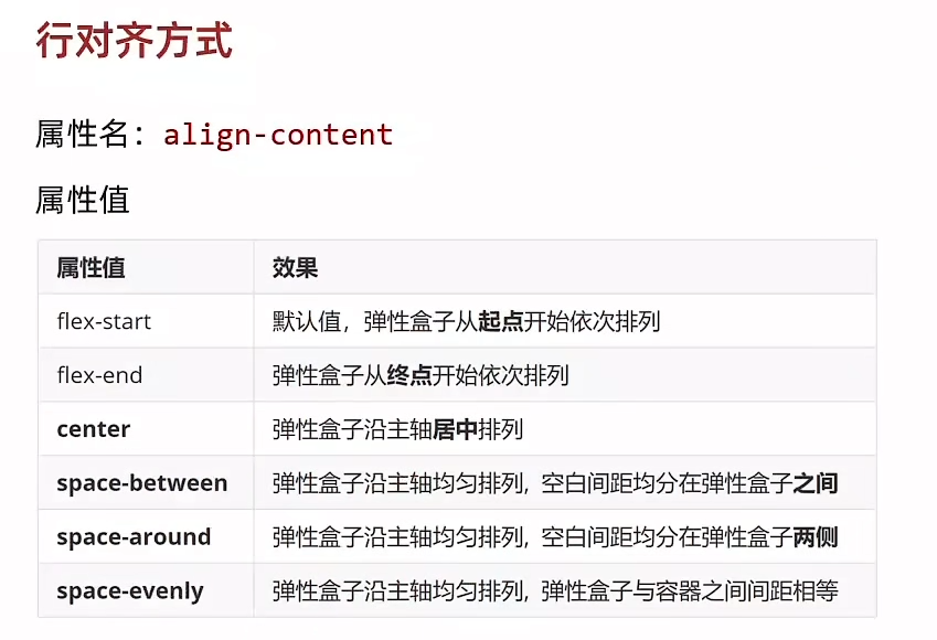 注:justify-content和space-content两个参数的属性值取值是一样的。