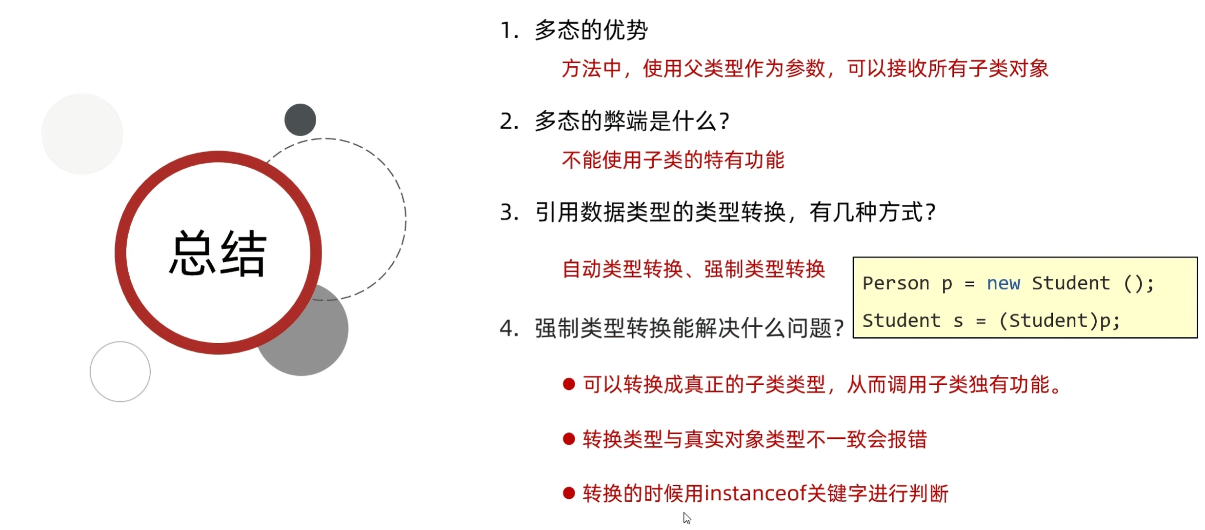 - Java的多态性允许我们通过父类引用来操作子类对象,这提供了灵活性,尤其在需要处理一组不同的子类对象时,可以统一通过父类接口来处理它们。