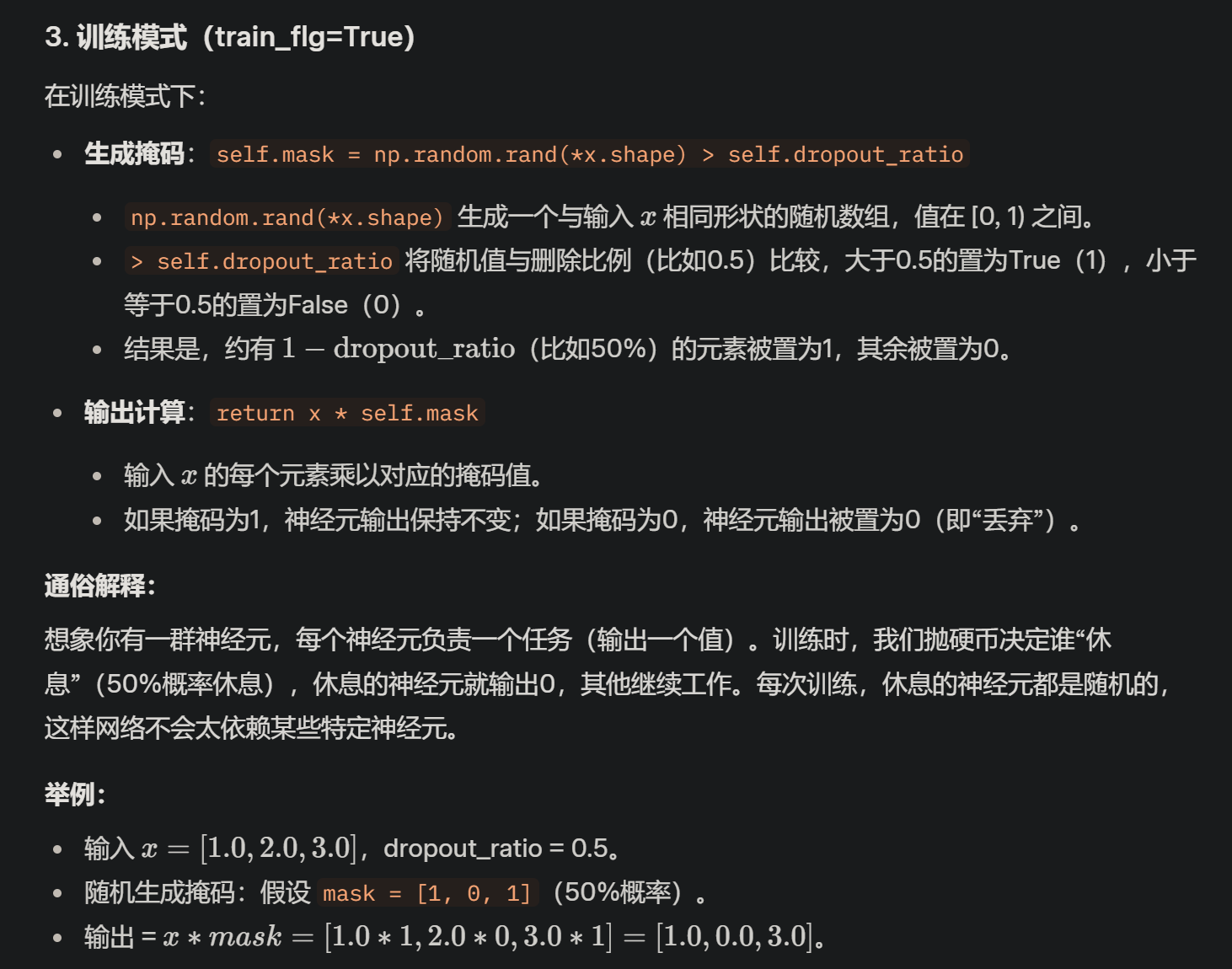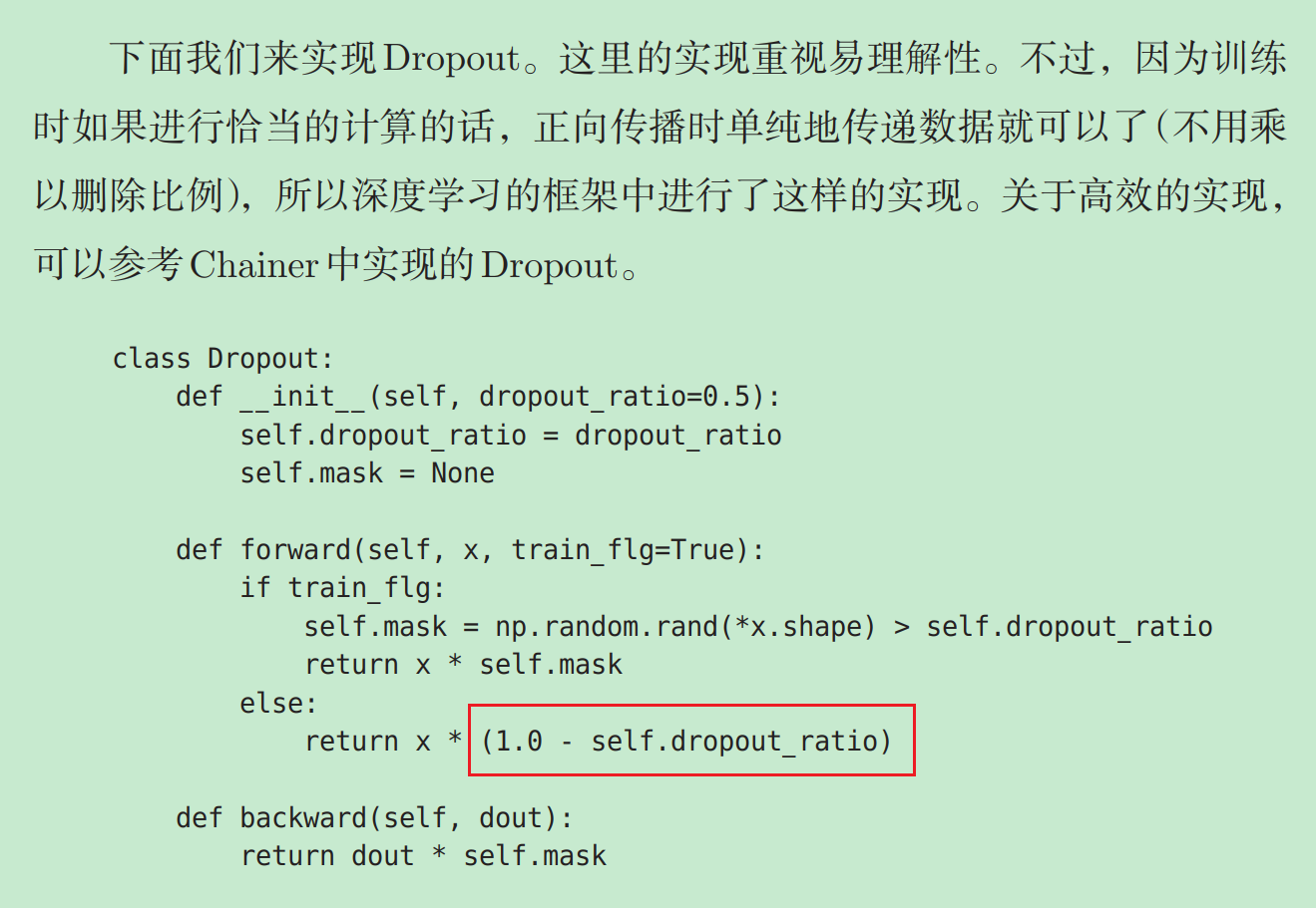 class Dropout: def __init__(self, dropout_ratio=0.5): self.dropout_ratio = dropout_ratio # 删除比例,默认为0.5 self.mask = None def forward(self, x, train_flg=True): if train_flg: # 训练模式 self.mask = np.random.rand(*x.shape) > self.dropout_ratio # 生成随机掩码 return x * self.mask else: # 推理模式 return x * (1.0 - self.dropout_ratio) # 红框部分 def backward(self, dout): return dout * self.mask