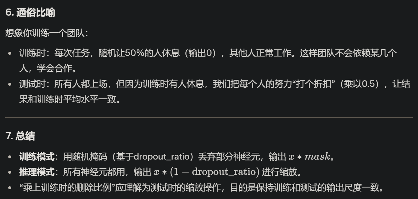 - self.mask:一个随机生成的二值掩码(0或1),决定哪些神经元被丢弃。