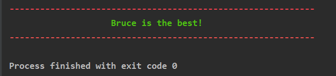 print('\033[91m' + '-' * 60 + '\033[0m') # 91m对应红色,92m对应绿色 print(' ' * 20 + '\033[92mBruce is the best!' + '\033[0m') print('\033[31m' + '-' * 60 + '\033[0m') # '\033[0m':重置所有终端样式(颜色、粗体等),确保后续输出不受红色影响。