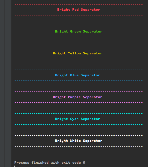 - 输出效果在支持 ANSI 的终端中为彩色分隔线,适用于日志、调试或界面美化。