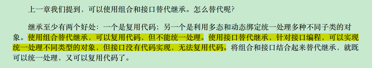 使用接口替代继承,针对接口编程,可以实现统一处理不同类型的对象,但接口没有代码实现,无法复用代码