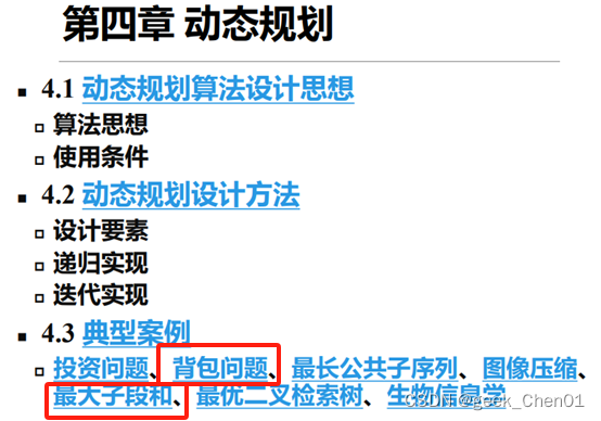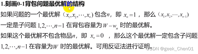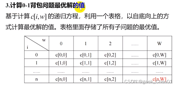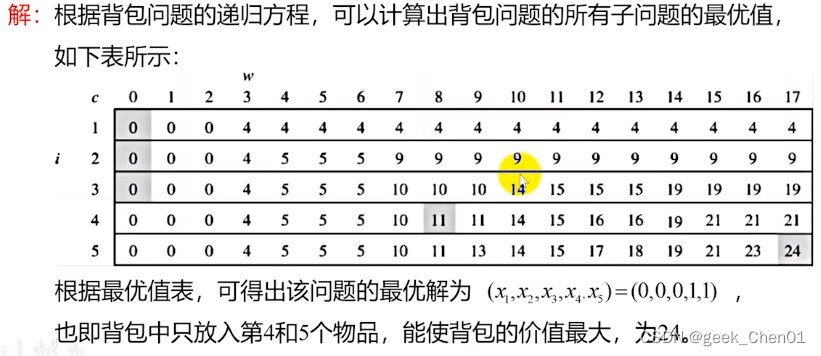 一般题目给出一个实际例子,要求解出递归方程c[i,w];求出结果--最优解;