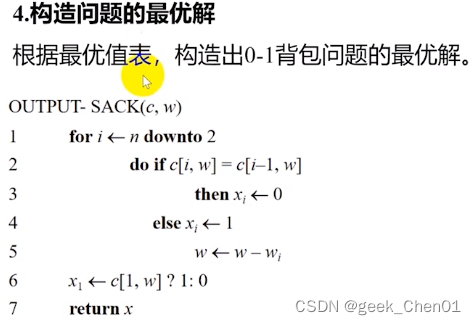 6:x1(第一个物品)的赋值【是边界,没法去比较第1个和第0个,所以单独拿出来说明】;语句即判断,if c[1,w] =1那么x为1,or为0;【c[1,w]即只考虑了第一个物品,那就要么装第一个,要么什么都没有;所以可以用0/1去判断】