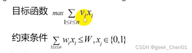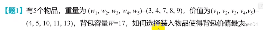 某商店有n个物品,第i个物品价值为vi,重量(或权重)为wi,背包的容量为W。每种物品只能选择完全装入或不装入背包,一个物品至多装入一次,因此该问题被称为0-1背包问题。目标是如何选择装入背包的物品,使装入背包的物品总价值最大。