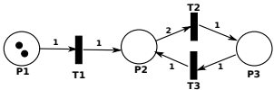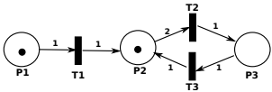 标记(Marking):标记 M是一个从位置到令牌数量的映射。例如,Figure 4的初始标记 M0为 P1↦2,P2↦0,P3↦0,表示P1有2个令牌,其他位置无令牌。