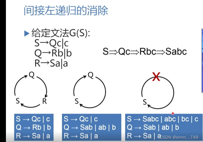如下图所示,间接左递归的消除就是循环圈不断减少非终结符的过程,那么最后会只剩下一个非终结符A的循环(即直接左递归),再消去直接左递归,并删去多余的语句,即完成。