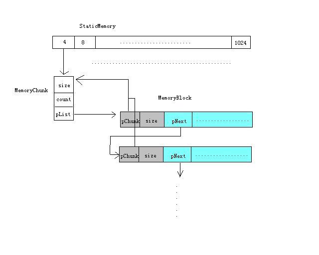 利用C/C++开发大型应用程序中,内存的管理与分配是一个需要认真考虑的部分。本文描述了内存池设计原理并给出内存池的实现代码,代码支持Windows和Linux,多线程安全。内存池设计过程中需要考虑好内存的分配与释放问题,其实也就是空间和时间的矛盾。有的内存池设计得很巧妙,内存分配与需求相当,但是会浪费过多的时间去查找分配与释放,这就得不偿失;实际使用中,我们更多的是关心内存分配的速度,而不是内存的使用效率。基于此,本文按照如下思想设计实现内存池。主要包含三个结构:StiaticMemory, MemoryChunk和MemoryBlock,三者之间的关系如下图所示: