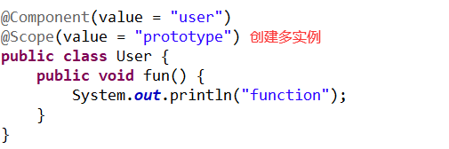1 import org.springframework.stereotype.Component; 2 3 @Component(value = "user") 4 public class User { 5 public void fun() { 6 System.out.println("function"); 7 } 8 }
