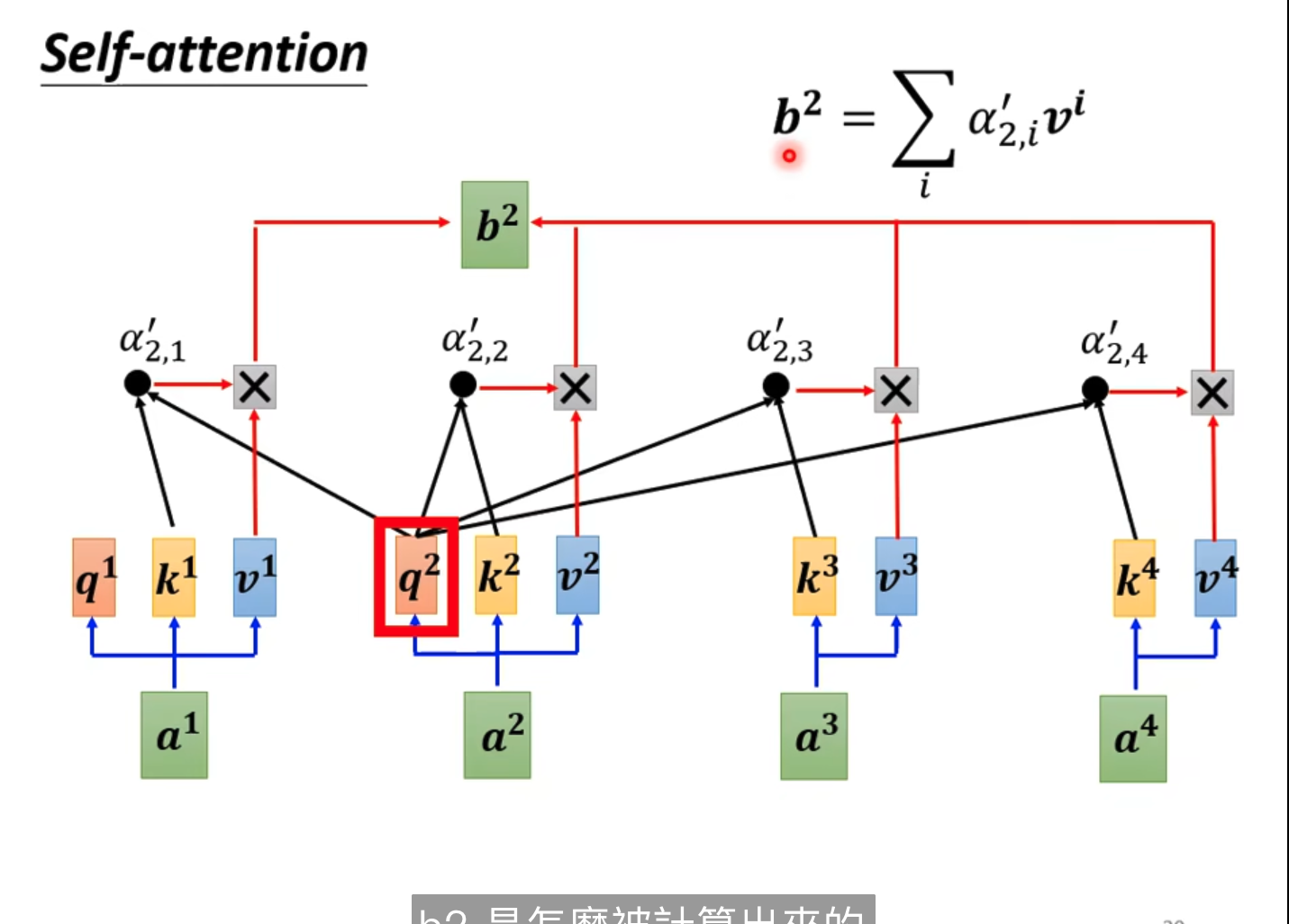 紧接着,我们使用当前的阿尔法与每一个向量a所计算出来的vi相乘,并求和。如果哪一个阿尔法乘上当前的v,最终的value越大,那么就会越接近当前我们的bi,在这里由于是使用的向量a1,因此是b1。所以越接近b1,则与当前a1 这个token的相关联的程度就越大。